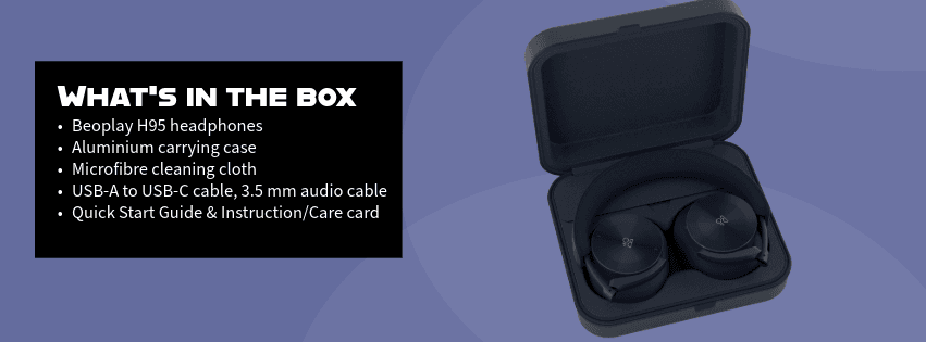 | Built-In Media | Aluminium carrying case, Beoplay H95 headphones, Microfibre cleaning cloth, Quick Start Guide & Instructions/Care card, USB-A to USB-C cable, 3.5 mm audio cable |