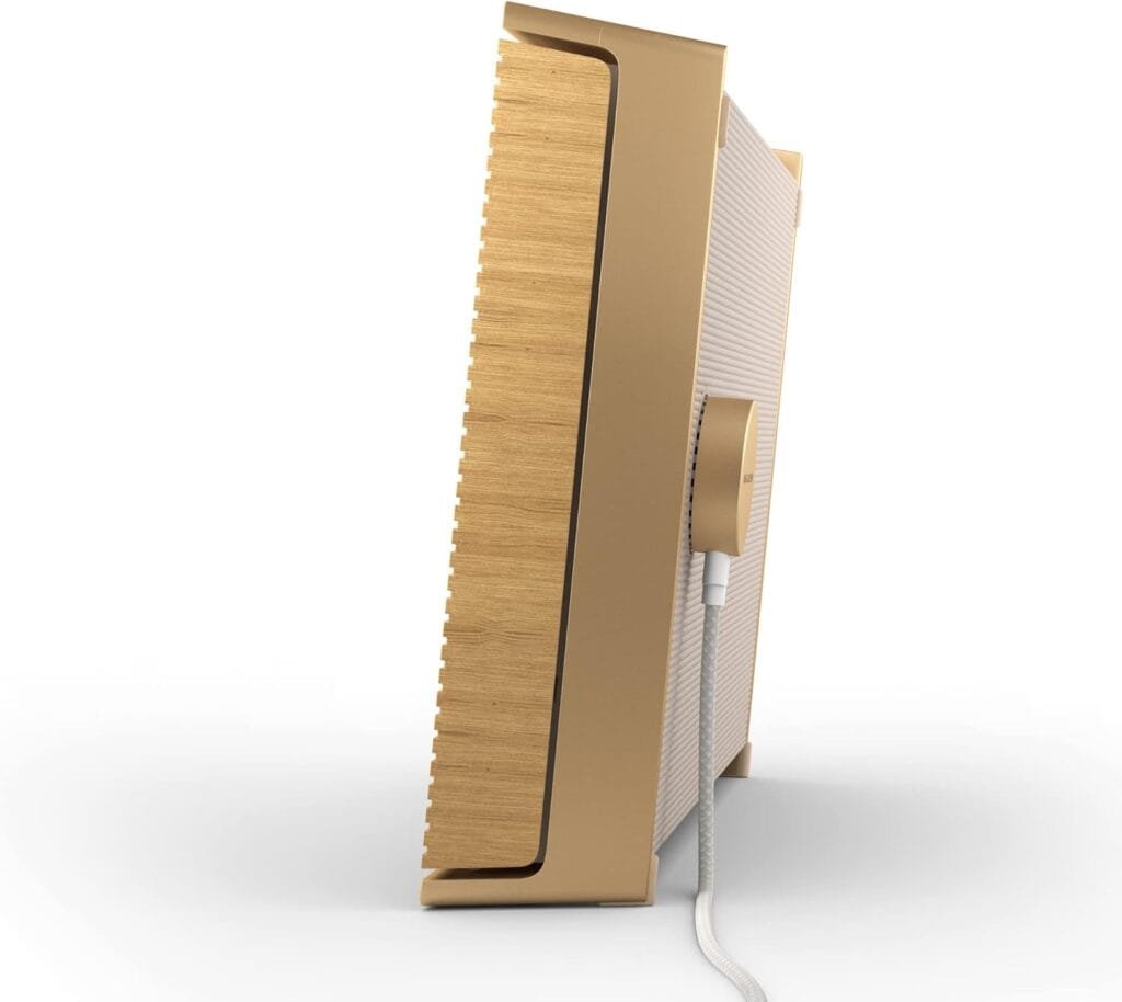 The frame is crafted from recycled aluminum, giving it both strength and a sustainable edge. The wooden grille, made from oak, brings a natural warmth that softens its modern silhouette. This careful mix of materials shows Bang & Olufsen’s commitment to sustainability — not as a marketing buzzword, but as a core design principle.